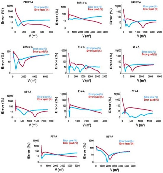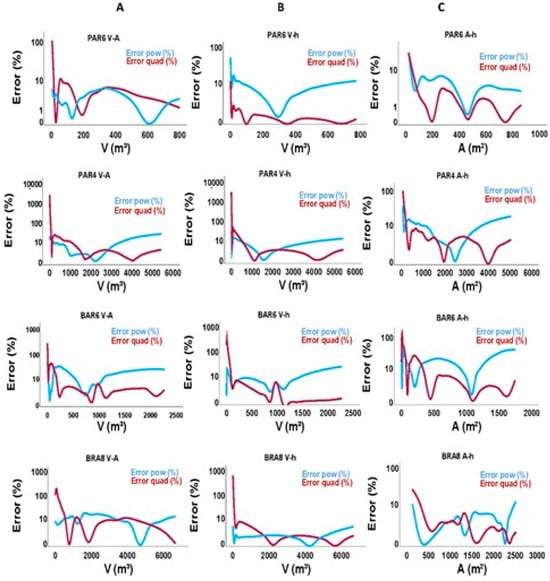 Figure 6 shows the errors as a function of the volume of water stored using power- and quadratic-specific models. Specifically, A, B and C columns in Figure 6 show the error in the V-A, V-h and A-h relationships. The V-A relationships are of particular interest in terms of the applicability of the equations and, according to Figure 6, the errors are relevant when the volume of water stored is low. Conversely, the errors tend to be close to the 10% when the volume of water stored is medium or high. Therefore, the models developed here are useful in times of a hydrological bonanza, but they will not be practical for low water levels (something common after dry spells).
