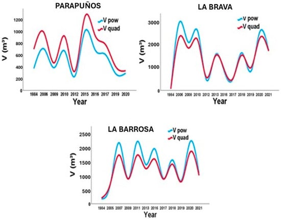 The temporal dynamics of the volume of water stored in the studied ponds for each farm is shown in the Figure 8. The volume of stored water showed a large variability that is given by the seasons, but also by the inter-annual variability of the Mediterranean climate. The dynamics is similar for each pond and for each type of function used to estimate the volume of water. For the Parapuños farm, the quadratic function overestimates the values produced by the power function, whereas in La Brava and La Barrosa farms, the opposite occurs.