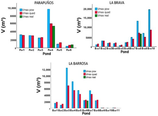 By means of pond-specific high-resolution DEMs, the Vmax of every pond was calculated and compared with the Vmax estimated using the power (blue) and quadratic (red) functions (Figure 9). According to this comparison, in small ponds like Par6 or Bar6, both functions estimated a volume of water stored close to the volume calculated using their high-resolution DEMs. For large ponds like Par4 and Bra8, the volume of water determined using their DEMs is close to that estimated by means of the quadratic function, while the power function clearly overestimates the Vmax.