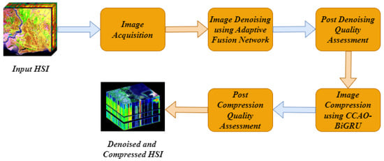 In this study, a novel image denoising and compression technique based on a deep learning model is proposed to retain the overall quality of an image without limiting the compression ratio. Here, three datasets, namely the Indian Pines dataset, the Washington DC Mall dataset, and the CAVE dataset were considered for the study. In the first stage, an improved adaptive fusion network is used to remove undesirable noise from the images. In the second stage, the denoised image is passed into the compression phase. In the compression stage, the images are compressed without compromising the quality using the CCAO-BiGRU model. The performance metrics, such as PSNR, SSIM, MSE, CR, RAE and spectral reflectance curve for various types of noise were analysed for the proposed and existing models. From these analyses, we proved that the proposed model is a better system compared to the existing models. In future research, the replacement of the activation function in the proposed model (ReLU and sigmoid) with generalized divisive normalization (GDN) can be performed to improve the PSNR value further. Additionally, the proposed algorithm can be tested using real-time data.