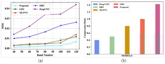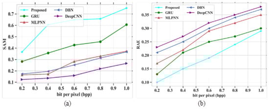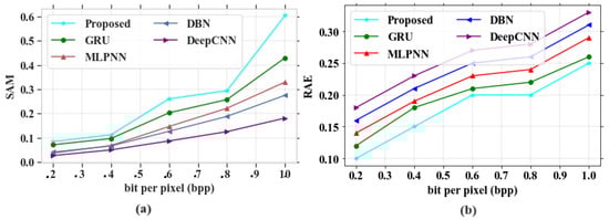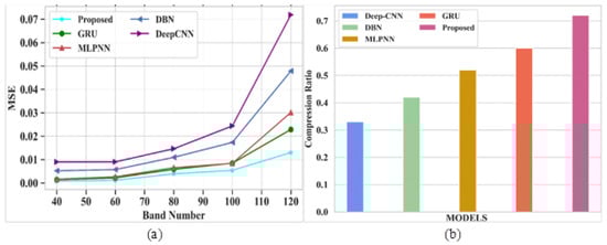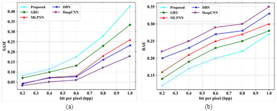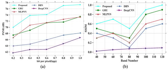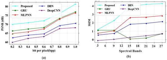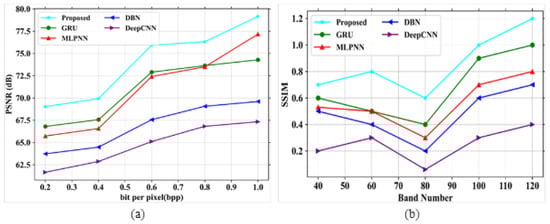 38]. Several drawbacks were noticed in the existing techniques, such as poor accuracy in image compression, improper compression of large size images, and the loss of important characteristics of images after compression. The proposed model obtained a PSNR value of 77.31 dB, a SAM of 0.7, a RAE of 0.29 at bpp 1.0, a SSIM of 1, an MSE at 0.013 at band number 120, a CR of 0.72, and the PSNR value based on a compression ratio at 10 is 82 for the Indian Pines dataset. For the Washington DC Mall dataset, the following values were obtained: PSNR of 79.16 dB, SAM of 0.35, RAE of 0.27 at bpp 1.0, SSIM of 1.2, MSE of 0.0065 at band number 120, CR of 1, and the PSNR value based on a compression ratio of 10 is 78.4. The proposed model obtained better values of PSNR, SAM, SSIR and RAE for both the datasets. It also gave a good plot of PSNR vs. CR curve which gives the impression of it being a better compression model. In addition, visual analysis also provided good results, which in turn proves the quality of the developed model. The proposed algorithm is compared with different existing methods in terms of quantitative metrics and it showed that the proposed model performs better compared to the existing models. The performance accuracy of the proposed work indicates that this can be utilized for mineral mapping as well as for agricultural applications. The PSNR values in [