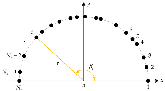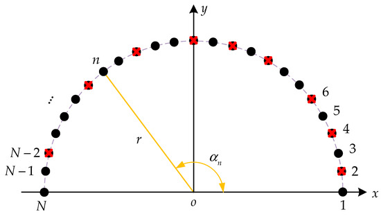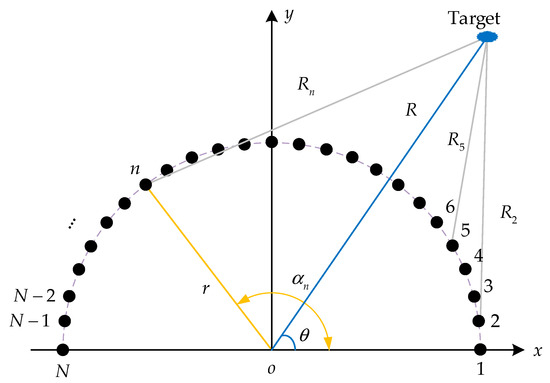 As depicted in Figure 1, a semicircular array consisting of N elements was considered, where the elements were uniformly distributed along a semicircular platform with a radius of r.