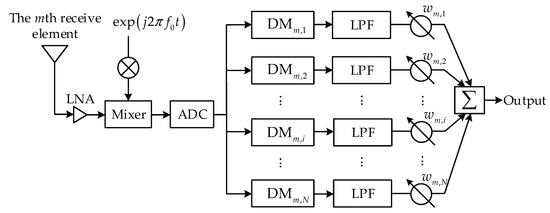 As described in the following, the inherent time-varying problem of the semicircular FDA was solved by combining the signal processing in the joint transmission and receiving domains. As shown in Figure 2, after being amplified in a low-noise amplifier (LNA), the output of the mth receiving element was mixed with a mixer of frequency . Then the mixed signals were sampled with an analog-to-digital converter (ADC) before being further mixed with a set of digital mixers (DMs). In the sequel, the signal in each channel was filtered by a low-pass filter (LPF), weighted, and summed for digital beamforming.