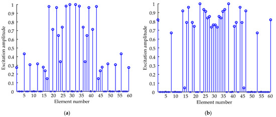 where represents the excitation amplitude of the mth receiving element, and is the selection variable. In particular, indicates that the mth element works, and means that the mth element does not work. To ensure that the array’s aperture did not change after the thinned optimization, it was necessary to retain the two elements located on the left and right boundaries of the semicircular FDA, i.e., when and , .