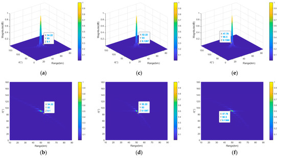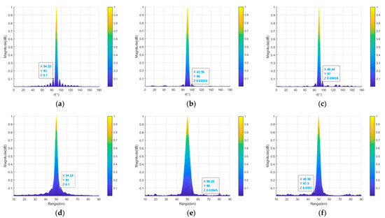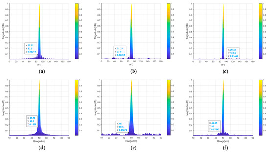 Projections of the transmit–receive beampatterns of the semicircular FDA with sin-FO in the range-angle dimensions: (a) full array in the angle dimension; (b) thinned array in the angle dimension; (c) sparse array in the angle dimension; (d) full array in the range dimension; (e) thinned array in the range dimension; (f) sparse array in the range dimension.