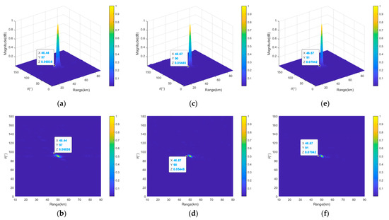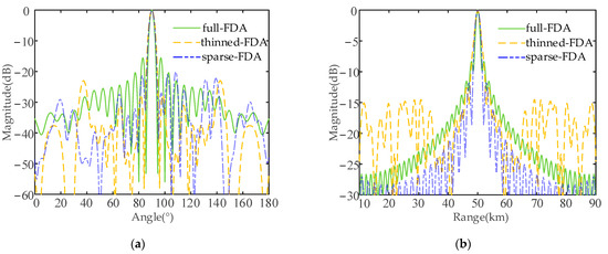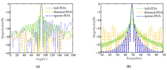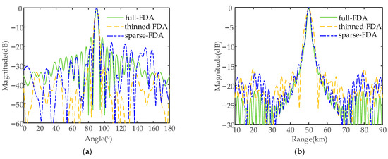 Figure 13 shows the projections of transmit–receive beampatterns of the semicircular FDA with sin-FO in the range and the angle dimensions before and after thinned and sparse distribution. If we compare Figure 13b,c with Figure 13a, it can be seen that after the thinned and sparse synthesis, the peak SLL of the beampattern in the angle dimension was reduced by 5.55 dB and 7.3 dB, respectively (from 10log10 (0.1267) = −8.97 dB to 10log10 (0.03529) = −14.52 dB and 10log10 (0.02362) = −16.27 dB). From Figure 13d–f, it can be seen that after thinned and sparse synthesis, the peak SLL in the range dimension was reduced by 4.39 dB and 3.67 dB (from 10log10 (0.1267) = −8.97 dB to 10log10 (0.04618) = −13.36 dB and 10log10 (0.05448) = −12.64 dB). The details of the peak SLLs are listed in Table 5.