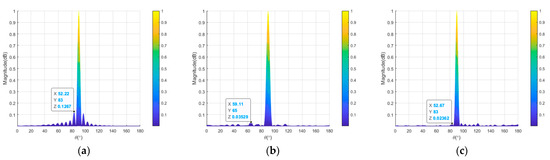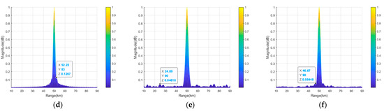 Figure 15 shows the projections of the transmit–receive beampatterns of the semicircular FDA with tanh-FO in the range and the angle dimensions before and after thinned and sparse distribution. If we compare Figure 15b,c with Figure 15a, it can be seen that after the thinned and sparse synthesis, the peak SLL of the beampattern in the angle dimension was reduced by 4.38 dB and 8.06 dB, respectively (from 10log10 (0.09219) = −10.35 dB to 10log10 (0.03364) = −14.73 dB and 10log10 (0.01441) = −18.41 dB). From Figure 15d–f, it can be seen that after thinned and sparse synthesis, the peak SLL in the range dimension was reduced by 4.41 dB and 3.65 dB (from 10log10 (0.1566) = −8.05 dB to 10log10 (0.05674) = −12.46 dB and 10log10 (0.07042) = −11.52 dB), respectively. The details of the peak SLLs are listed in Table 7.