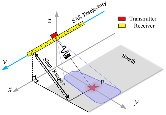 To facilitate the understanding of the imaging process, we draw an imaging geometric diagram of the slant range plane, as shown in Figure 2. We take the trajectory direction as the x-axis called the azimuth direction, also known as the along-track direction, and the direction perpendicular to the trajectory is the r-axis, which is called the range direction, also known as the cross-track direction. is the distance from the m-th receiver to the reference receiver, and the position of the reference receiver coincides with that of the transmitter. The SAS platform insonifies the ideal scattering point represented as a red pentagram by moving in a uniform straight line at a speed v along the azimuth direction.