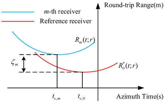 The sampling interval between the m-th receiver and the reference receiver is [61]. When the reference receiver samples at , the equivalent sampling time of the m-th receiver is . If the curvature’s difference of the RCM curves of different receivers is ignored, then the RCM curve of the m-th receiver is regarded as the translation of the reference receiver in the slant plane, with the translation amounts on the t-axis and r-axis being and , respectively, as shown by the blue curve in Figure 3. Based on the geometric relationship, can be expressed as