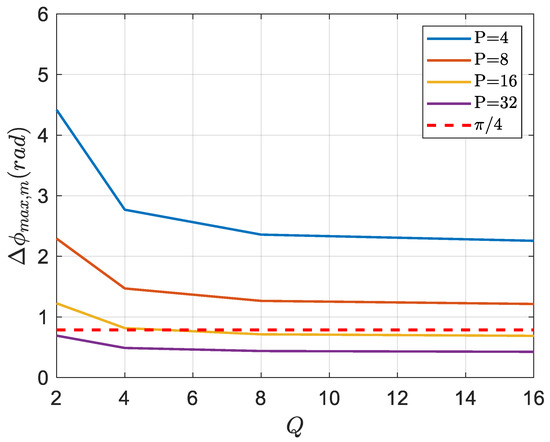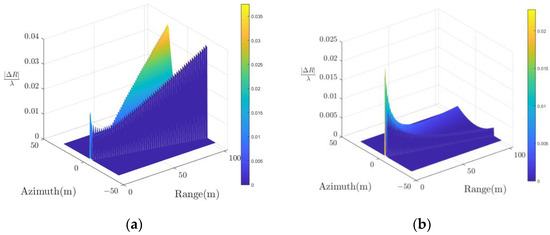 Now, it is necessary to ensure that there is within each frequency domain subband. is zero at of the p-th subblock (corresponding sampling point ), and the maximum value at the edge of the subblock is . For the PTRS at , PTRS is divided into Q subbands. If , reaches its maximum value in the q-th subband when the minimum range frequency and the maximum azimuth frequency are taken. If , reaches its maximum value in the q-th subband when the range frequency and azimuth frequency are both maximized. It can be seen that the errors in different subbands within the p-th subblock are only related to and . According to (45), Q subbands are traversed in the p-th subblock to obtain the maximum phase error, which can be expressed as
