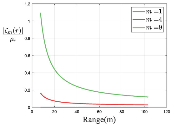 Assuming the transmitter is located in the middle of the array, the curves of changing with r are shown in Figure 5 based on the parameters in Table 1. From Figure 5, it can be seen that the variation of exceeds one range resolution unit, so range subblocks processing or interpolation [60] is needed to ensure that the variation of in each range subblock is less than one range resolution unit. Therefore, for the n-th subblock, is the center of the subblock, and can be used to perform envelope offset (delay) compensation. The corresponding compensation function is