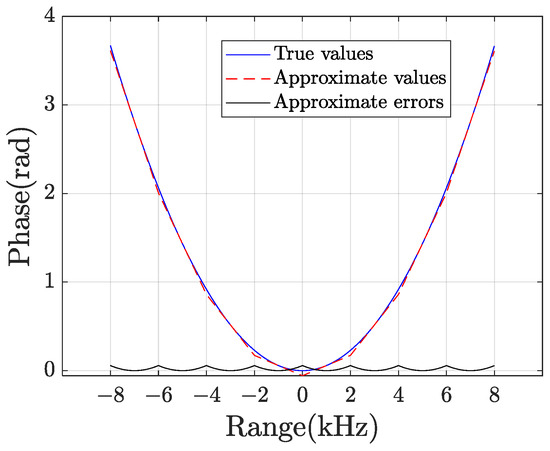 where the subband subscript is , and the frequency point in the q-th subband is . After dividing k into subbands, in (43) can be linearly approximated in each subband, which we refer to as piece-wise linear approximation (PLA). For each segment, the tangent at the center of the frequency subband is taken as the approximate value of the subband, so that the center can be fully compensated and there is no phase jump at the edge, as shown in Figure 6. The approximate expressions for is expressed as follows: