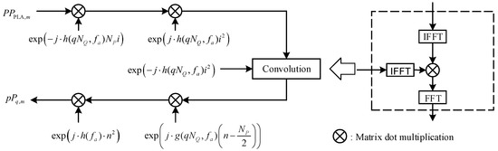 Equation (54) is equivalent to multiplied by , then multiplied by , and finally convolved with . To achieve higher computational efficiency, frequency domain convolution can generally be achieved through time domain multiplication, and finally multiplied by to obtain the result after RCMC and SRC. The quick implementation of CZT is shown in Figure 8.