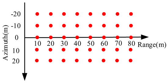 If is discarded, it is equivalent to ignoring azimuth range coupling terms. The high-order phase error increases with the increase of range. When the HOP term is equal to , the corresponding range is the maximum allowable imaging range, also known as the high-resolution imaging range (relative to the starting point of the swath). The larger the relative bandwidth, the smaller the high-resolution imaging range. In low-frequency broadband signals, the azimuth range coupling is very severe, severely limiting the high-resolution imaging range. If the HOP term at the center of the swath is compensated, then the high-order phase at the center of the swath is zero, which can be fully focused. The maximum allowable imaging range is transformed into the maximum permissible imaging range relative to the center of the swath, which is half the swath. However, the HOP terms at both edges of the swath may still exceed . To solve the above problem, we divide the range into many subblocks in the time domain, and the center of each subblock is used as a reference range to compensate for the HOP, ensuring that the HOP terms at both edges of each range subblock are less than .