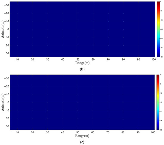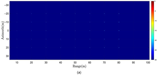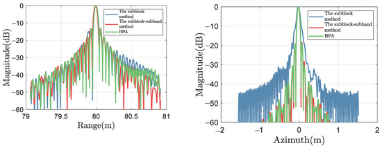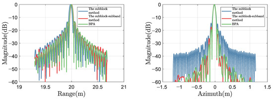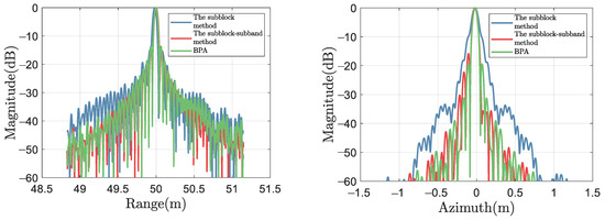 The theoretical value of azimuth IRW is 5.10 cm, related to the SAS’s transmitter size. Indicators that cannot truly reflect image quality due to main-lobe broadening or amplitude distortion are represented by underlined numbers, while black numbers represent superior results except for BPA’s results. From Table 2, it can be seen that for range cross-sections, the subblock CZT method has poor IRWs on all targets, while the subblock–subband CZT method has improved IRWs, which is related to theoretical values. This is due to the subband processing. For azimuth cross-sections, the ISLR of the subblock–subband CZT method is 5.84 dB lower than that of the subblock method for the P1 target, resulting in a reduction in the possibility of azimuth ghosting targets. For P2 and P3, due to azimuthal IRW broadening, the measured values of PSLR and ISLR of the subblock CZT method are distorted. However, the measured values of the subblock–subband CZT method are close to theoretical values. Therefore, simulation results can demonstrate the superiority of the proposed subband processing method.