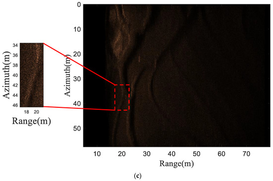 To further validate the effectiveness of this method, we presented the measured data collected in 2019 by Wuhan Huanda Electronics Co., Ltd. at Zhanghe Reservoir in Jingmen City, Hubei Province, China. The sonar parameters used in the experiment are the same as the parameters used in simulation. The subblock CZT method [60], the proposed subblock–subband CZT method, and BPA [66] were used to focus the measured data, and the results are shown in Figure 15. From the red dashed rectangular box, it can be seen that without subband processing, the subblock CZT method yields the worst results, making it difficult to distinguish the focusing result from the background. The use of subband processing can improve the quality of imaging. The imaging quality of the proposed subblock–subband CZT method is comparable to that of BPA, and contour information can be clearly seen.