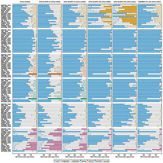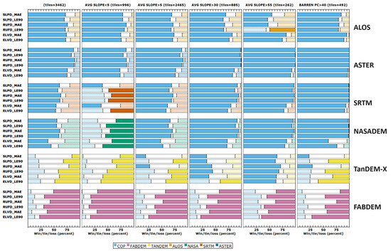 Another way to compare DEMs looks at pairwise comparisons as to how each compares to a reference DTM (Figure 3). CopDEM appears as the leftmost bar in the figures as the base comparison so that the graphs will be similar when we add additional elevation bands with edited DTMs derived from CopDEM. CopDEM has also been widely regarded as the best performing of the one-arc-second DEMs [17,55]. We use the same colors for each DEM throughout this paper; the solid color shows the DEM that wins (has a lower FUV) in more tiles, and the cross-hatch pattern shows the loser for that comparison. At low-resolution versions of the graphs, the cross-hatch pattern appears to be a less saturated version of the solid color. The white zone in the middle shows ties, where the two DEMs are the same within the selected tolerance. Some tolerance is required to deal with floating point arithmetic; we chose the tolerances using the distribution of differences within the database, aiming for a figure with about 10% of the tiles being tied across all the DEMs. The tolerance depends on the criterion; for elevation it is very small and for other parameters much larger. With only five categories, this is less nuanced than the results in Figure 2, but provides a graphic summary and discriminates the differences in criteria behavior.