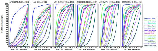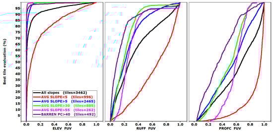 A separate table in the database [24] contains the FUV criteria results. Because those evaluations range between 0 and 1, they cannot be easily combined with the results from the difference distributions. Figure 4 summarizes the database and bears careful scrutiny to understand our efforts to interpret complicated relationships. The FUV evaluations on the x-axis go from 0 on the left, where the test DEMs compare perfectly with the reference DTM, to 1 on the right, where the two are uncorrelated. On the y-axis, we sort by the best evaluation in any of the test DEMs and plot them by percentiles. The 0th percentile has the best match to the reference DTM, and the 100th percentile at the top has the worst. Until about the 50th percentile for elevation FUV, all the DEMs are close to zero—there are very clear, consistent differences, but they do not show up at this scale since the Pearson correlation coefficients are so close to 1. Low FUV values indicate better agreement, thus elevation is clearly the best/easiest criteria to match because the FUV curve is always farthest to the left, often by a wide margin. The legend shows the criteria and the derived grids in the order in which they generally appear, from left to right in the graphs, which indicates how well the test DEMs match the reference DTM for that derived grid. We arrange the panels in order of increasing DEM performance based on the filters, with the best panel on the right. The low-slope tiles appear on the left panel because they consistently have high FUV evaluations. As tile slope increases, the FUV values typically decrease, which is also the case for the most barren tiles.