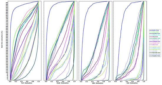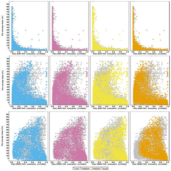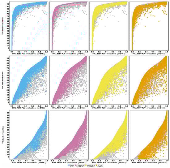 In Figure 5, we show the results by test DEM for all tiles; sorting the plot by the best evaluation reduces noise. The test DEMs that most closely match the reference DTM, with a low FUV evaluation, plot at the bottom left corner of the graph, and those which do not match the reference DTM plot at the top right. To discern the patterns in the FUV criteria results, we plot the FUV on the x-axis. Roughness and profile curvature have lower values of FUV at all percentiles. We only show the data for the best DEMs (CopDEM, FABDEM, TanDEM-X, and ALOS); data for the others are included in the database [24] and in some summary graphics. The three criteria shown include one in the lower range but not the worst performing (profile curvature), one in the central group (roughness), and the best (elevation). More than 3200 files are on the plot, with each colored DEM in a separate panel, with the gray background points showing the other DEMs.