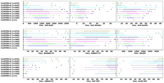This ranking applies strictly only to the first cluster, which we interpret as being most amenable to creating a one-arc-second DEM from space. It is almost entirely based on the radar sensor used in CopDEM and TanDEM-X, but applies broadly to all the test tiles. Cluster 2 has slightly higher FUV values for all of the criteria, with a large spike (indicating poorer overall performance) in plan curvature. Cluster 3 follows cluster 2, but the convergence index and tangential curvature both spike. The tile characteristics in the clusters (Figure 10) show that the percent of the tile that is forested increases substantially. Cluster 1 includes tiles with very high percentage forested values derived from land cover [31] for arid forest areas in the Canary Islands and desert southwest of the United States, where the low vegetation density classified as forest apparently does little to affect the radar sensor used for CopDEM. The real drop in performance occurs with cluster 4, with a noticeable spike in tangential curvature and large increases for all parameters other than elevation.