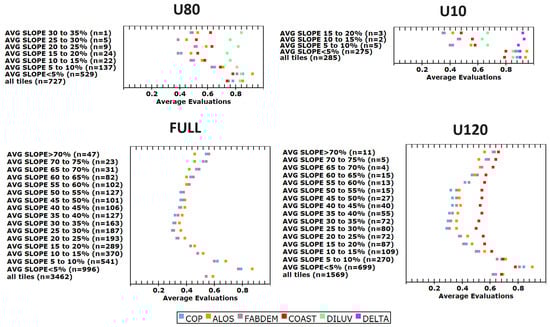 The panels shown in the left column of Figure 2 show the FULL elevation range database. The results for the FULL data set depend on the choice of test areas; as we increased the number of low-elevation tiles along the coast for our evaluation of edited DTMs, these conclusions changed, and we added multiple filters to better explore the controls on the comparisons to the reference DTM. The differences between these results and those in the earlier DEMIX study [17] result from the over-representation of coastal tiles. The best way to eliminate the bias from low-coastal area tiles would be to only consider the tiles with average slopes above 5%.
