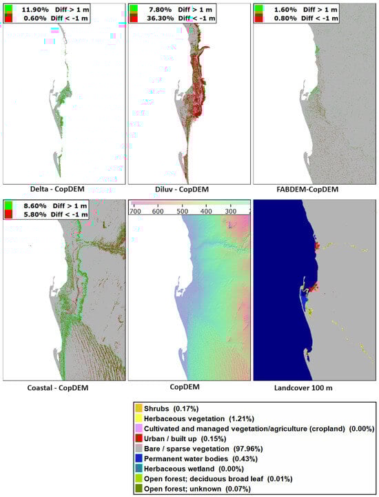 Since the earlier comprehensive comparison of global DEMs [17], three additional DEMs (CoastalDEM [11], DiluviumDEM [12,13], and DeltaDTM [14,15]; refer to Table 1) have attempted to create a DTM using CopDEM as the starting point for machine learning. These focus on coastal areas, and unlike FABDEM, that includes all of Earth’s landmass, they have different cutoffs in terms of the maximum elevation included. Although FABDEM was not specifically calibrated for floodplain/coastal areas, it did prioritize checking in floodplain areas. We thus have 4 elevation categories for the elevation range of the global one-arc-second DEMs: FULL for the entire range of Earth, U120 (limit 120 m), U80 (limit 80 m), and U10 (limit 10 m) (Table 1). When we refer to the U80 data, for instance, these data include not only DiluviumDEM but the reference DTMs and other test DEMs in higher-elevation bands masked to have the same coverage area.