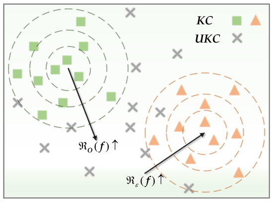 To effectively identify unknown targets and correctly classify known targets, the OSR model confronts both empirical classification risk and open space risk [12]. The goal of the OSR task is to find a measurable recognition function by minimizing the combination of on labeled known data and on potential unknown data simultaneously. Figure 2 illustrates and in the embedding space, with dashed circles indicating decision boundaries. As the radius of concentric circles decreases, more known targets are misidentified as unknown classes, leading to an increase in . Conversely, as the radius increases, more unknown targets are erroneously classified as known classes, thereby increasing . This implies a negative correlation between and . To strike a balance between these risks, Yang et al. [17,18] proposed prototype representation as an alternative to the SoftMax layer, presenting generalized convolutional prototype learning (GCPL) and convolutional prototype network (CPN) for constructing a compact embedding space. To explicitly model open space risk, Chen et al. [19,20] forged a novel path, successively proposing reciprocal points learning (RPL) and adversarial reciprocal point learning (ARPL).