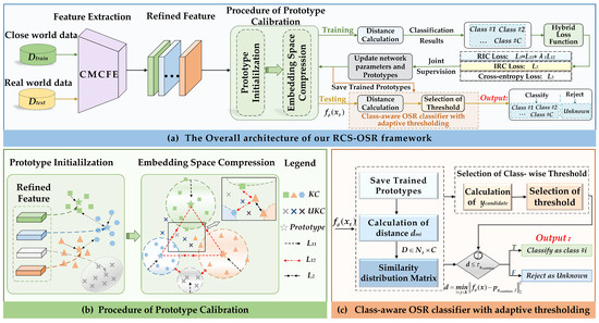 The overall architecture of our proposed RCS-OSR is illustrated in Figure 3a. In the training process, known classes from are first fed into the CMCFE module, from which refined features with enhanced discriminability can be extracted. The CMCFE module consists of a multi-scale abstract features aggregation branch and an auxiliary features injection branch, which will be introduced in detail in Section 3.2. Upon initializing the prototypes, we formulate a hybrid loss function to jointly supervise model training and calibrate the prototypes by optimizing the embedding space. This hybrid loss function comprises three components: RIC loss, IRC loss, and cross-entropy loss, with the RIC loss being a combination of and . Figure 3b elucidates the principles of RIC loss and IRC loss in the prototype calibration procedure. By attracting samples to their corresponding prototypes and penalizing the distances between prototypes of different classes, the RCS-OSR method achieves reinforced class separability, thereby enhancing classification performance. Upon completion of the training, the prototypes associated with each category are saved.