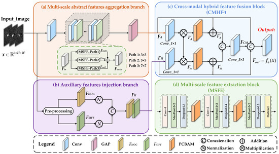 The detailed architecture of the CMCFE module. Specifically, the CMCFE consists of two branches: (a) a multi-scale abstract features aggregation branch for extracting multi-scale abstract features, which will be introduced in Section 3.2.1 and (b) an auxiliary features injection branch for obtaining handcrafted features, which will be described in Section 3.2.2. Afterwards, we devised (c) the block to fuse and from the two branches, which will be presented in Section 3.2.3. Additionally, (d) illustrates the detailed structure of the block. In this figure, , , and denote convolution, global average pooling and operations, respectively. The internal structure of is shown in Figure 5.