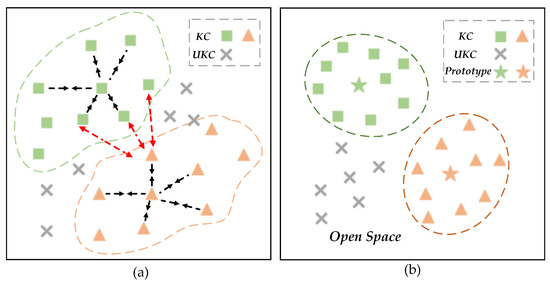 As mentioned above, constructing an embedding space with reinforced class separability is crucial for improving the performance of OSR. As shown in Equation (9), the center loss [49] can increase intra-class compactness by minimizing the distance between a sample and its corresponding prototype. As illustrated in Figure 6b, prototype learning promotes a more compact embedding space under the constraint of center loss.