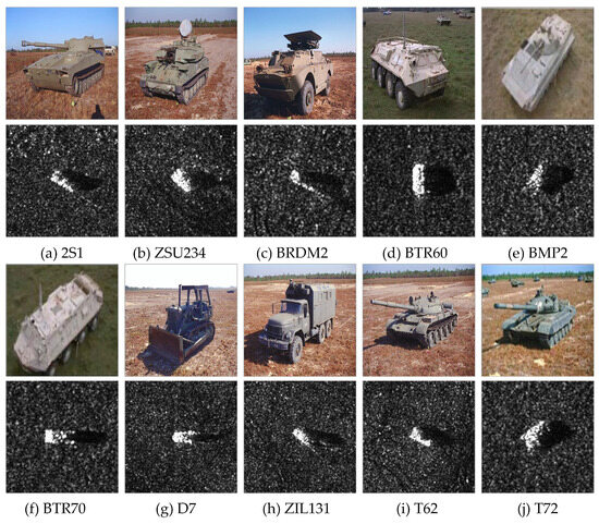 The MSTAR dataset, provided by Sandia National Laboratory in the U.S., operates in the X-band frequency and HH polarization mode, with a resolution of 0.3 m × 0.3 m. Figure 7 shows the SAR images and their corresponding optical images. It includes ten vehicle classes with different depression and azimuth angles, as detailed in Table 1. The training and testing sets are based on depression angles of and , respectively.