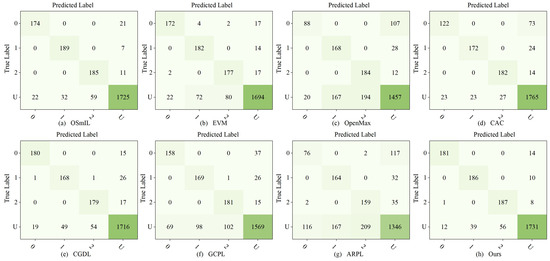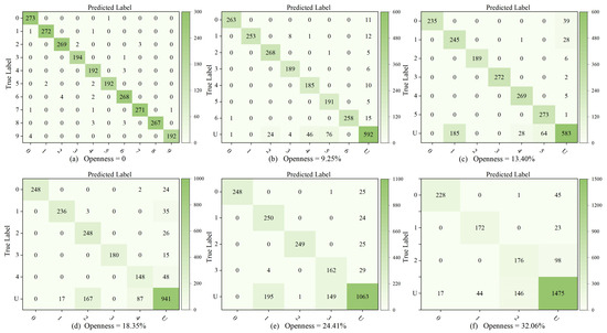 Figure 11a presents the confusion matrix under an condition of 0, corresponding to a closed-set scenario. The results indicate that the proposed RCS-OSR exhibits minimal misclassifications and achieves high recognition accuracy. As increases, both the number of unknown classes and the risk associated with open space rise. Nevertheless, the algorithm maintains robust classification capabilities. Notably, in environments with low levels of , the algorithm demonstrates strong recognition of unknown classes, suggesting that it can establish a more distinct decision boundary. In contrast, even when faced with high and some misclassifications of unknown classes as known ones, the algorithm retains high accuracy in both known class classification and unknown class recognition, demonstrating its robust classification performance.