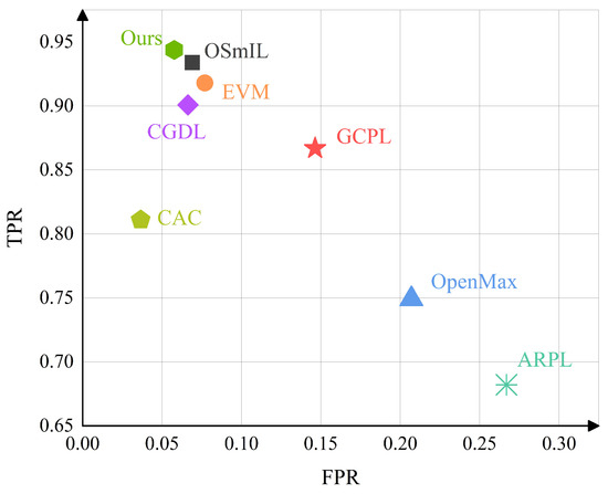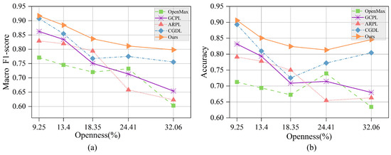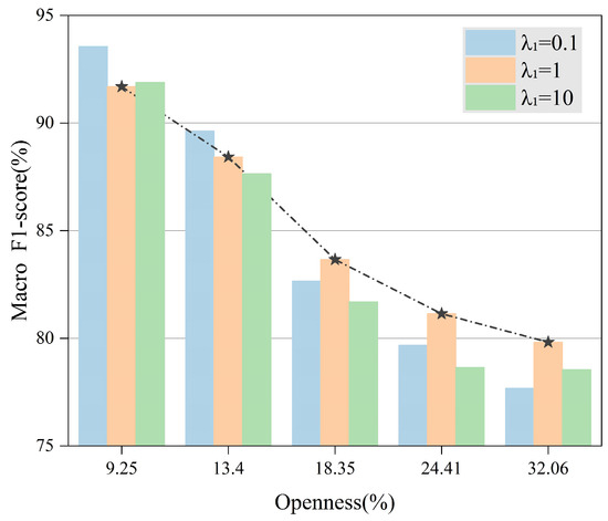 Next, we fixed the values of and . As illustrated in Figure 14, with the increase in , the model’s performance gradually declines. When the is low, the performance of outperforms others. This is attributed to the , which can effectively enhance intra-class compactness and promote tighter clusters. With higher openness, where unknown classes predominate, increasing can guide the model to emphasize inter-class separation, thereby improving performance. However, it is noteworthy that the model’s efficacy diminishes with excessively large values. Consequently, an intermediate value is typically more appropriate for most scenarios.