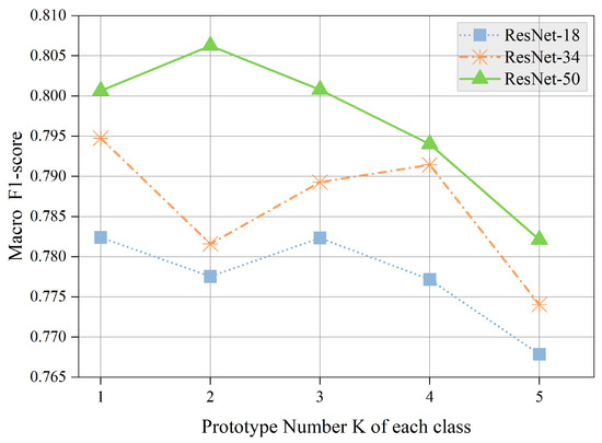 In prior experiments, each class was assigned only one prototype. To investigate the impact of varying the number of prototypes, we conducted trials across three distinct network architectures: ResNet-18, ResNet-34, and ResNet-50 [51]. As shown in Figure 12, setting more prototypes can better represent the internal differences between classes, thereby facilitating recognition performance. Nevertheless, it is observed that a surge in the number of prototypes does not significantly boost performance and may even lead to a decline.