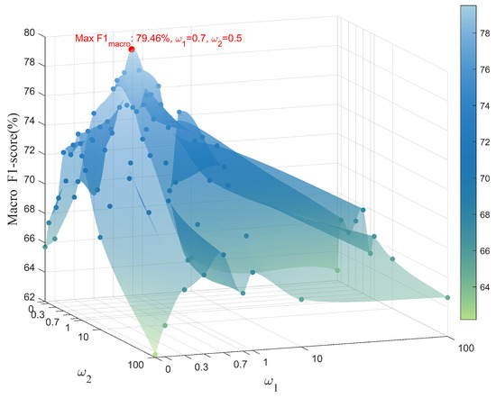 Initially, we fixed to analyze the influence of and . As shown in Figure 13, when both and are set to zero, the metric is only 65.72%. The reason is that when the model is solely supervised by the cross-entropy loss, it tends to separate prototypes of different classes to minimize classification errors. In this case, the model’s performance may be influenced by intra-class variations. However, with the addition of and regularization, the model not only optimizes its classification ability but also its prototype distribution, resulting in an improvement of approximately 13.74%, demonstrating their effectiveness. Furthermore, as the weights of and increase, the curve exhibits an initial rise followed by a decline. This is because when the weights are excessively high, the model prioritizes prototype distribution optimization at the expense of its classification capability. To simultaneously ensure the optimization of feature learning and classification ability, we set and .