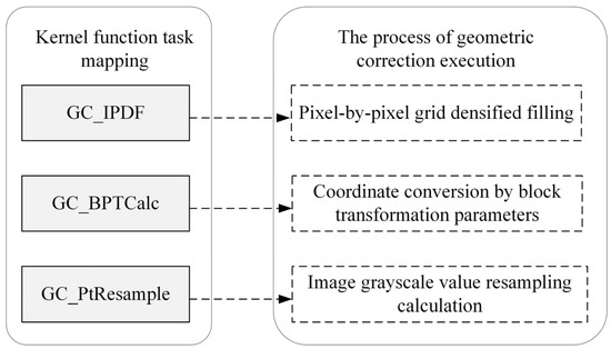 First, kernel function task mapping is performed to determine the logical flow of geometric correction execution on the GPU. Since the pixel densified calculation, direct linear transformation calculation, and image resampling calculation are all grid-/pixel-independent, they have high parallelism. Therefore, based on the principle of maximum GPU parallel execution, the above three steps are mapped to the GPU for execution. Considering the logical continuity of the three steps, in order to reduce the additional overhead caused by repeated kernel function calls, the three steps are further mapped to three independent kernel functions: GC_IPDF, GC_BPTCalc, and GC_PtResample, as shown in Figure 6. Specifically, the GC_IPDF kernel function assigns each CUDA thread to densify pixel grids in the row and across-track directions; the GC_BPTCalc kernel function assigns each CUDA thread to calculate its coordinates in the original image and its pixel coordinates in the image to be stitched using the coordinate mapping parameters calculated by the CPU; and the PixelResample kernel function assigns each CUDA thread to utilize the pixels around the densified pixel in the original image, determine its grayscale value through bilinear interpolation, and fill it into the image to be stitched.