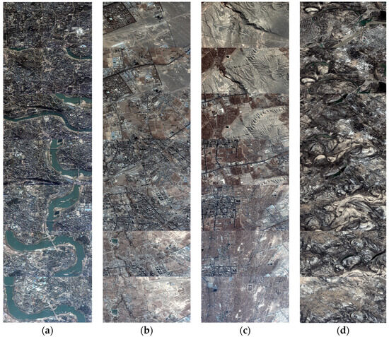 This study selected four sets of LuoJia3-01 frame array push-frame data obtained at different times and locations; the specific information is shown in Table 2. The spatial resolution of these data is 0.7 m, with the image size of a single frame being 7872 (cross-track) × 5984 (along-track) × 3 (bands) pixels. Each set of data contains 60 frames, with an imaging duration of 30 s. These data cover different scenes such as mountains, rivers, plains, and cities. The satellite travels at a speed of 7 km/s, which would theoretically result in the satellite covering a distance of 210 km. However, during the push-frame imaging process, the satellite performs agile maneuvers to extend the exposure time for each frame by continuously adjusting its attitude angles. This results in an effective speed along the flight direction of the camera image that is lower than the satellite speed. The overlap between adjacent frames is 90%, leading to a total effective image length of about 24 km. Considering the significant overlap in the sequence images, we select a frame interval with 10 for processing and presentation, as shown in Figure 7 (top-to-bottom direction). We can see that these data have complex overlaps between frames, which need to be corrected and stitched through algorithms to meet application requirements. The DEM required for the processing is the publicly available global ASTER DEM, which has an elevation accuracy of within 50 m and is sufficient to meet the elevation accuracy requirements for the geometric correction of push-frame strips.