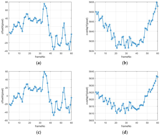 According to an analysis of the results in Figure 8, the number of overlapping rows in the track direction of adjacent frame images is between 5605 and 5655 rows. The number of overlapping rows varies significantly between different inter-frame images, and it also differs between different pixels in the same row. In the across-track direction, the offset between inter-frame images is between −60 and 80 pixels, and it changes non-systematically with the frame number. It can be foreseen that, in the push-frame imaging mode, in order to maintain nearly north–south vertical stripe imaging, the satellite needs to perform large attitude maneuvers in real time, resulting in the unstable imaging of the platform and a decrease in attitude measurement accuracy. This, in turn, causes the misalignment and distortion of the stripe images.
