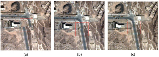 During the push-frame process of the LuoJia3-01 system, the satellite is capable of agile maneuvering, actively imaging along the target area. At this point, the star field data observed by the star tracker become a line segment rather than a point, significantly impacting the accuracy of centroid extraction for star points and increasing the random measurement errors of the star tracker [10,11,12]. Consequently, there is noticeable random jitter in the attitude angles, leading to non-systematic misalignment between adjacent frame images. This misalignment is manifested not only in translational displacements along the track direction but also in across-track direction displacements, as well as minor rotations and changes in resolution scale, as shown in Figure 2. According to a geometric positioning analysis without ground control points (GCPs), a 1″ attitude error will result in a 3.4-pixel error, and the relative positioning error of the homologous points in adjacent frame images can reach up to 50 pixels. The relative relationships between sequence frames will be calibrated in preprocessing through high-precision attitude processing [13,14,15], on-orbit geometric calibration [16,17,18], and sensor correction [19,20], all of which are conducted on high-resolution remote sensing satellites. However, traditional calibrated processing methods primarily address systematic errors, rendering the handling of these random errors particularly challenging.