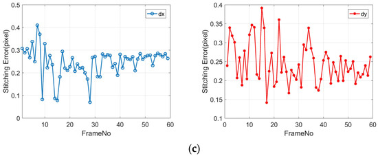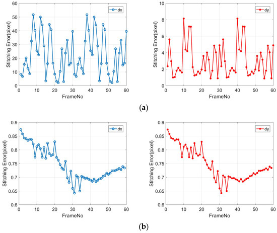 - In Section 2.1.1, after eliminating gross errors, several homologous points are obtained. Using Equation (4) and the least squares algorithm, the motion compensation parameters between frames, namely (a0, a1, a2, b0, b1, b2), can be determined.