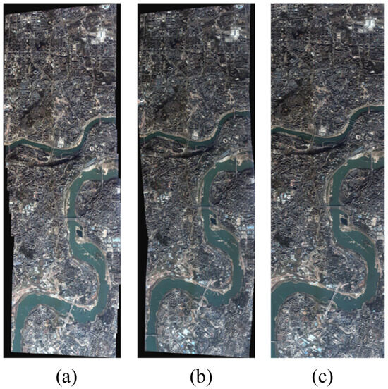 A strip geometric correction product is generated through sequential frame image geometric correction and stitching. Its geometric internal accuracy can well reflect the relative geometric accuracy between frames. Figure 14 shows the overall stitching results of all data under different experimental methods. Due to the inaccuracies in satellite attitude measurements during agile imaging, we can see that, in Figure 14a,b, the stitching results of the sequence frame images exhibit approximate north–south vertical stripes, with distorted deformation at the edges of the stitched images, and the degree of inter-frame misalignment and deformation undergo non-systematic changes with the image row coordinate position. It can also be observed that, within adjacent frame images, there are cross-track direction offsets, along-track direction offsets, and relative rotation amounts, consistent with the inter-frame misalignment caused by the previously analyzed attitude angle errors, severely affecting the data application. After processing with our method E3, very good visual stitching results are achieved, as shown in Figure 14c, effectively eliminating misalignment and cropping the image’s black edges that are not aligned.