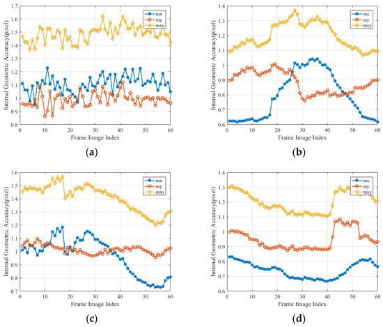 The internal geometric accuracy of stitched images can not only reflect the internal geometric consistency of sub-frame images, but can also demonstrate the overall internal geometric consistency of stitched images. The internal geometric accuracy of stitched images is determined by calculating the mean errors between the image plane coordinates of the stitched images and the corresponding matching point image plane coordinates.