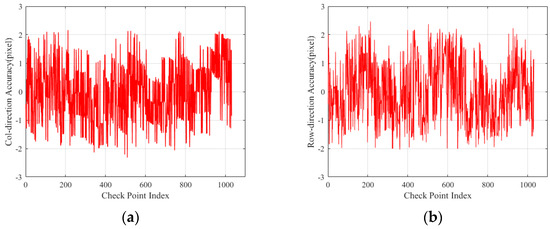 The internal geometric accuracy of the image is determined by calculating the statistical values of the relative errors between the checkpoints in the image, reflecting the magnitude of non-linear errors within the image. As show in Equation (16), and are the positioning errors in the x-direction (across-track direction) and y-direction (along-track direction) for the i-th checkpoint, and the average value of the absolute positioning errors of all checkpoints is selected as the reference error. For checkpoints, the mean errors , , and are calculated in the x-direction, y-direction, and plane direction, respectively.