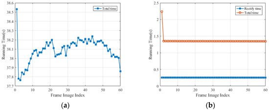 The server used for data processing is equipped with an Intel Xeon Gold 6226R CPU (Intel Corporation, Santa Clara, CA, USA) @ 2.90 GHz, an NVIDIA Quadro RTX 4000 GPU (NVIDIA, Santa Clara, CA, USA) with 8 GB of video memory, CUDA version 11.8, and the CentOS Linux release 7.9.2009 operating system. Additionally, the device has 128 GB of RAM and a 2 TB high-speed Nvme SSD. It is important to note that the processing time discussed in this study does not include the data reading and writing time. We use “chrono class” (CPU) and “cudaEvent class” (GPU) to accurately time the algorithm-related processes, with precision down to milliseconds, without impacting the algorithm’s performance. To evaluate the performance of the method proposed in this study, we assess it from two aspects: the time consumption of each step in the single-frame geometric correction algorithm and the overall time consumption of the strip’s geometric correction.