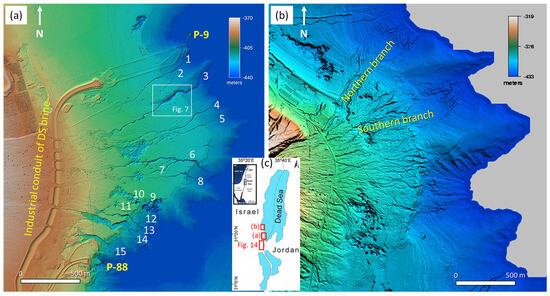 LiDAR topography of the two study areas draped upon hill−shaded DSMs. (a) Ze’elim fan. Gully numbers (in white) are after [3]. (b) Hever fan. (c) Location maps of the study areas.