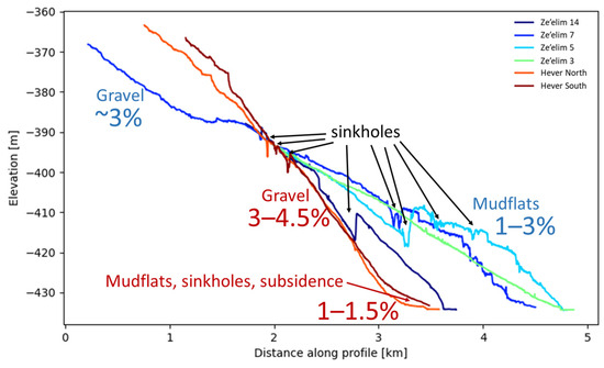 A catchment area of ~180 km2 in the north-eastern Hebron Mountains is drained to the DS through the Hever gorge that opens to the Hever fan (Figure 1b). The fan is ~3 km long and ~3 km wide at the shoreline. It consists of alluvial terraces of different elevations and ages and is dominated by braided gravel channels incised into older terraces and soft units of the Lisan and Ze’elim Formations. East of the −430 m elevation contour line, the alluvial deposits of the fan change over to a 300−500 m wide stretch of mudflats that were exposed during the last years due to the DS level drop and are currently incised by new gullies. The gradient of the braided streambeds in Hever fan is 3−4.5% while the gradient of the mudflats is 1−1.5% (Figure 2). Boreholes drilled in the Hever fan about 1 km from the present shoreline penetrated the “Sinkhole Salt” layer at depths of 20−35 m. The current fluvial activity during flash floods occurs along two major stream branches at the northern part of the fan (Figure 1b).