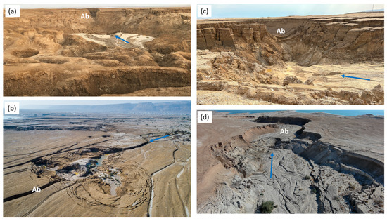 Photos of recharge sinkholes at Ze’elim fan streambeds. Blue arrows mark the flow direction. Ab—abandoned gullies, overhanging downstream of the recharge sinkholes. For location, see Figure 1a. (a) Gully 6. (b) Gully 7. (c) Gully 13. (d) Gully 14. Drone picture was taken by Liran Ben Moshe.