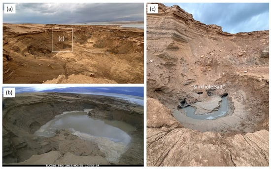Discharge sinkhole 10a (see location in Figure 5b). (a) View east, February 2024. (b) TLC picture showing water discharge following the 25 March 2019 flood. (c) The nested sinkhole at the northern wall of the major sinkhole, February 2024, exposing the “Sinkhole Salt” layer (white layers with small cavities), the dissolution channel openings, and groundwater flow.