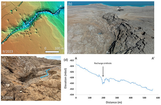 Sinkholes and subsidence along the course of gully 3. (a) LiDAR DSM, July 2023 (see location in Figure 1). The location of profile A−A’ (panel d) is shown in a dashed white line. The area around the recharge sinkhole is marked by a circle. (b) Drone photograph of the recharge area (sinkhole marked by white circle), January 2024, taken by Liran Ben Moshe. (c) Streambed sinkhole recharging floodwater after the 15.2.2024 flood. (d) Elevation profile A−A’ along the gully, September 2023 (location shown in panel a). Note that this recharge sinkhole does not appear in 2020 (see Ze’elim 3 profile in Figure 2).