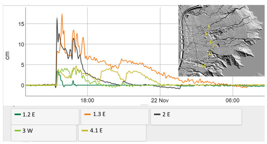 Water levels at five overpasses during the 21–22 November 2021 flood in Ze’elim. See inset for location. The overpasses are marked by white numbers, and streams are marked by yellow numbers. E and W stand for eastern and western hydrographs, respectively (Figure 3c).